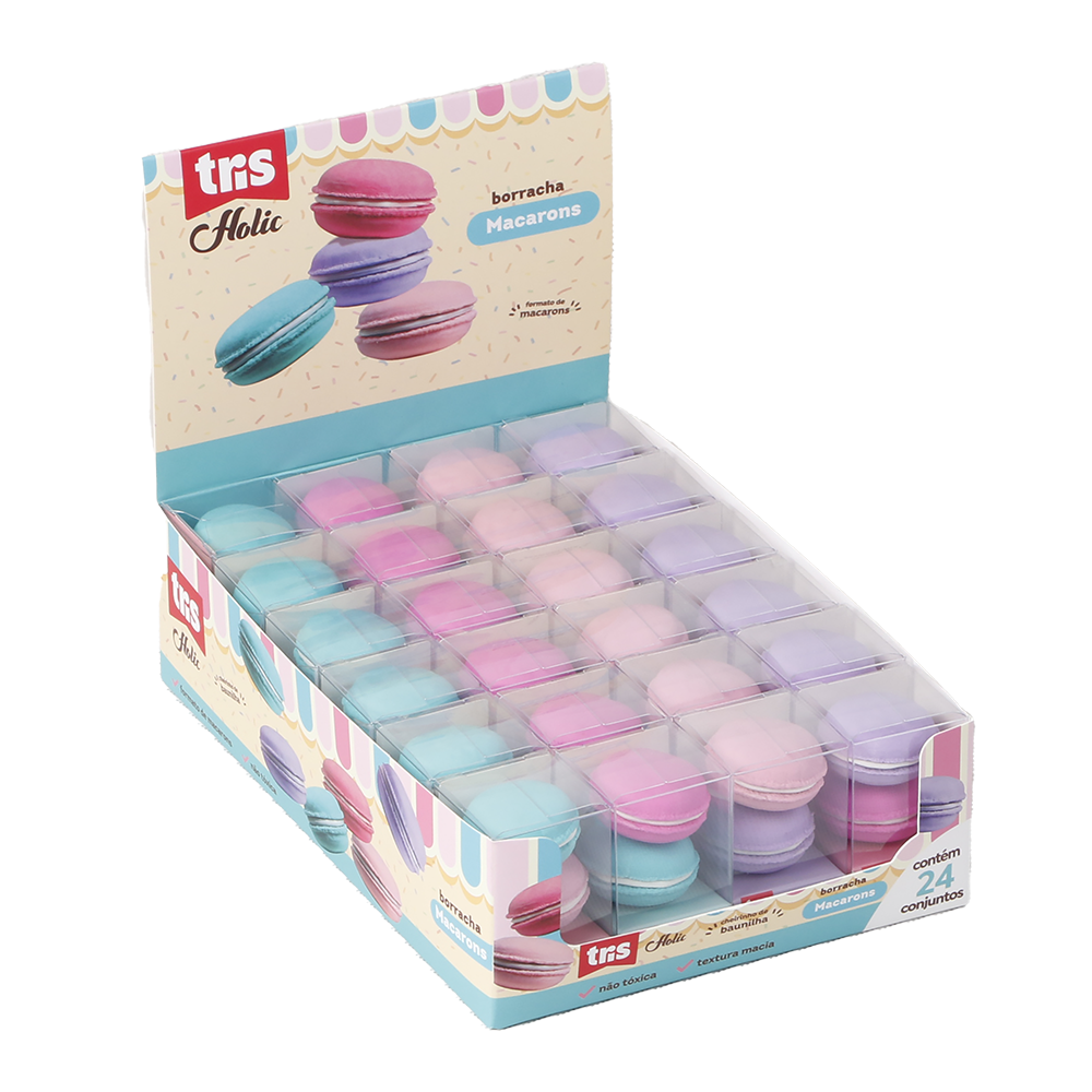 A coleção Docinho traz para as papelarias produtos inspirados nas delíci as do universo da confeitaria! Donuts, balinhas, sorvetes e muito mais! É pura fofura! A borracha macaron é igual ao docinho! Com cheirinho de baunilha e cores pastel, é uma doçura! Vem em estojo de acetato com duas borrachas cada! Textura macia! *produto não comestível